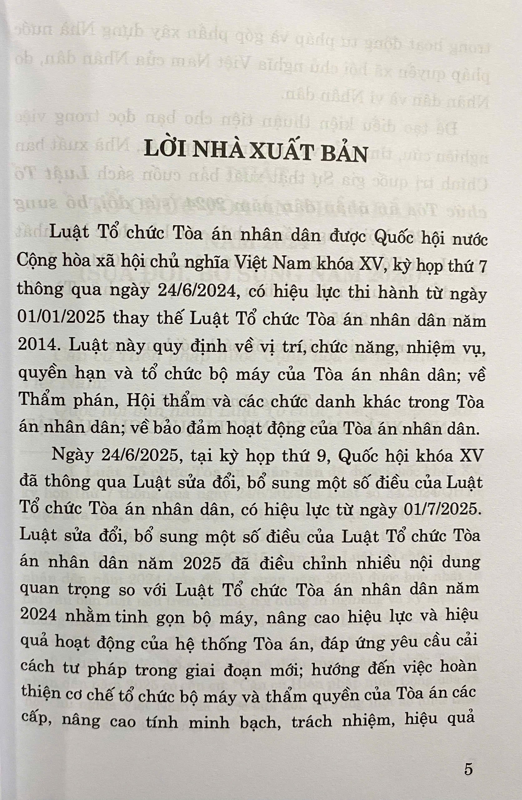 Ngày 24/6/2025, tại kỳ họp thứ 9, Quốc hội khóa XV đã thông qua Luật sửa đổi, bổ sung một số điều của Luật Tổ chức Tòa án nhân dân, có hiệu lực từ ngày 01/7/2025. Luật sửa đổi, bổ sung một số điều của Luật Tổ chức Tòa án nhân dân năm 2025 đã điều chỉnh nhiều nội dung quan trọng so với Luật Tổ chức Tòa án nhân dân năm 2024 nhằm tinh gọn bộ máy, nâng cao hiệu lực và hiệu quả hoạt động của hệ thống Tòa án, đáp ứng yêu cầu cải cách tư pháp trong giai đoạn mới; hướng đến việc hoàn thiện cơ chế tổ chức bộ máy và thẩm quyền của Tòa án các cấp, nâng cao tính minh bạch, trách nhiệm, hiệu quả hoạt động tư pháp và góp phần xây dựng Nhà nước nháp quyền xã hôi chủ nghĩa Việt Nam của Nhân dân, do Nhân dân và vì Nhân dân.