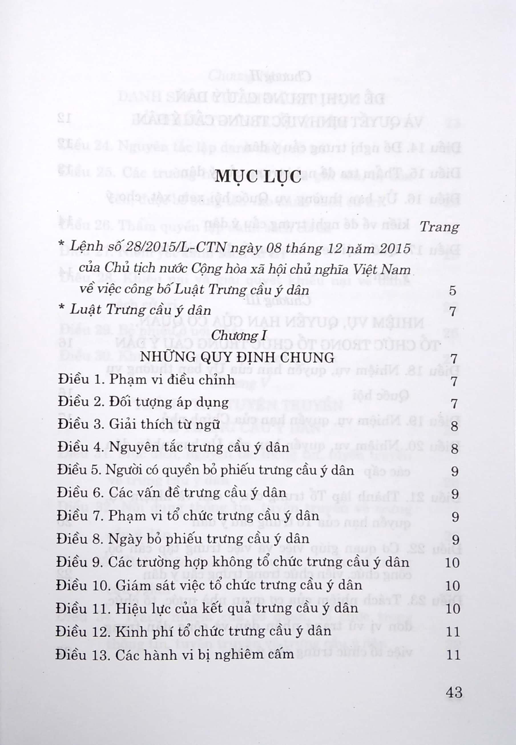 Mua tại TiktokLuật Trưng cầu ý dân (hiện hành) được Quốc hội khóa XIII, kỳ họp thứ 10 thông qua ngày 25/11/2015, có hiệu lực thi hành từ ngày 01/7/2016. Luật gồm 8 chương, 52 điều, quy định về việc trưng cầu ý dân; nguyên tắc trưng cầu ý dân; nhiệm vụ, quyền hạn của cơ quan, tổ chức trong tổ chức trưng cầu ý dân; trình tự, thủ tục quyết định việc trưng cầu ý dân và tổ chức trưng cầu ý dân; kết quả và hiệu lực của kết quả trưng cầu ý dân…