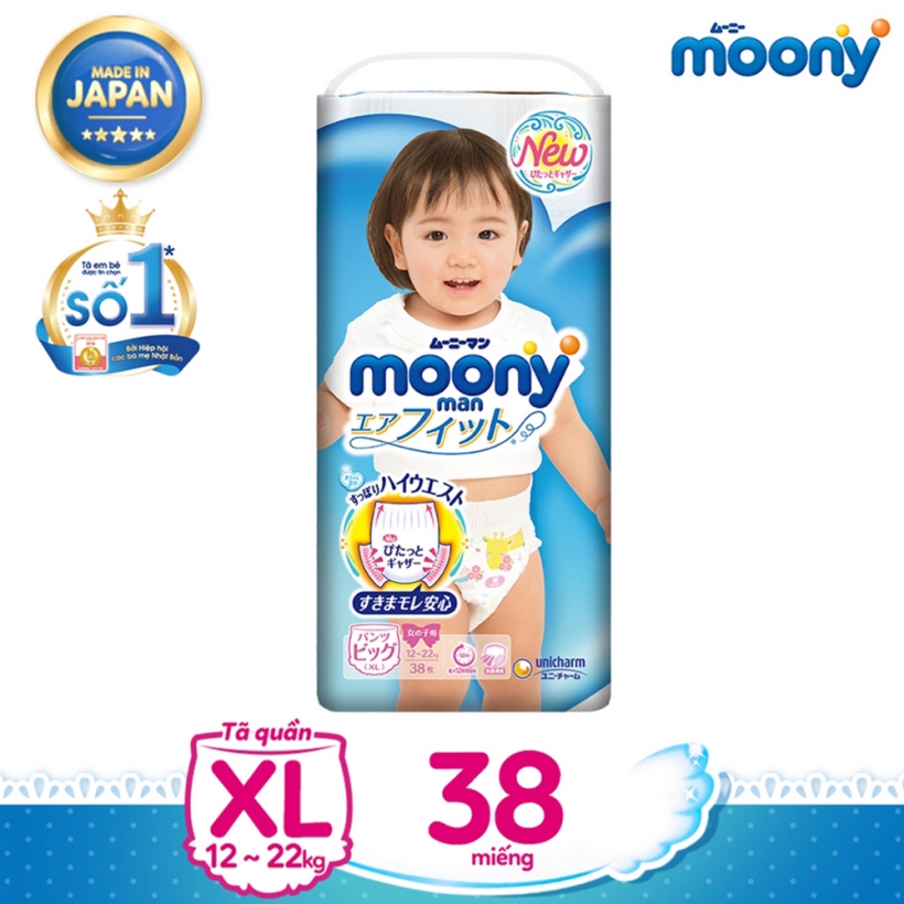 - Tã quần size XL 38 miếng dành cho bé gái từ 12 - 17kg ĐẶC ĐIỂM NỔI BẬT Thiết kế hiện đại với thun chân 6 sợi siêu mềm Phần thun hông và thun chân của bỉm mềm mại hơn bao giờ hết với đặc tính cải tiến thun chân 6 sợi. Đặc biệt là dải thun ống chân có thiết kế to bản giúp giảm áp lực đàn hồi trên da bé, không để lại vết hằn đỏ gây tổn thương da. Vách chống trào thông minh Vách chống trào thông minh giữ chất lỏng thấm nhanh và không bị trào ra bên ngoài, cho bé luôn khô thoáng cả ngày dài. Sợi Nano siêu nhỏ và mịn Toàn bộ bề mặt của Moony được cấu tạo từ chất liệu sợi nano siêu nhỏ và mịn, khiến tã không những vô cùng dịu nhẹ mềm mại mà còn cho phép không khí lưu thông giúp làn da bé có thể “thở” tự nhiên, từ đó tránh hăm bí khi mặc tã. Chỉ thị ướt báo thời điểm thay tã Mẹ có thể nhận biết thời điểm thay tã dễ dàng dựa vào vạch màu chỉ thị ướt trên miếng tã. Khi vạch màu tự động chuyển từ màu vàng sang màu xanh lá, mẹ sẽ biết đã đến thời điểm thay tã. THÔNG TIN THƯƠNG HIỆU Moony là thương hiệu tã nhập khẩu cao cấp từ Nhật - một sản phẩm của tập đoàn Unicharm - là một trong những tập đoàn lớn nhất tại Nhật Bản chuyên về các loại tã giấy, bỉm, giấy ướt dành riêng cho em bé được rất nhiều bà mẹ của nhiều nước trên thế giới yêu thích.