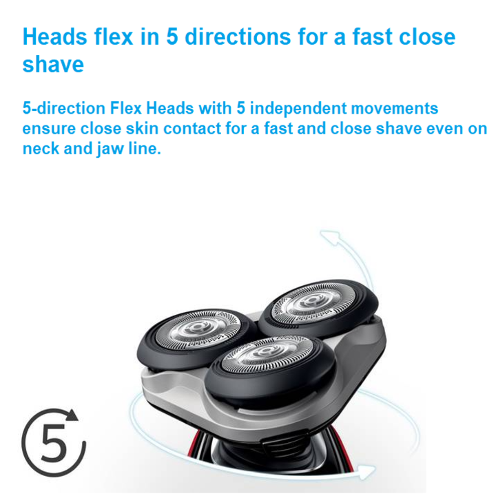 • Đầu cạo Flex linh hoạt theo 5 hướng có thể tự do di chuyển theo 5 hướng khác nhau, đảm bảo tiếp xúc sát với da giúp bạn cạo râu nhanh và sát kể cả ở vùng cổ và quai hàm. Máy cạo râu Philips S5390/12 có đầu tỉa để tỉa tóc mai và ria mép