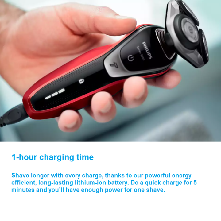 • Khi sạc pin trong 1 giờ, bạn sẽ có tối đa 45 phút để cạo râu, tương đương với 15 lần cạo. Bên cạnh đó bạn cũng có thể sạc nhanh trong 5 phút cho một lần cạo khi cần gấp. Đèn tích hợp 3 mức pin chỉ báo và đèn báo khóa