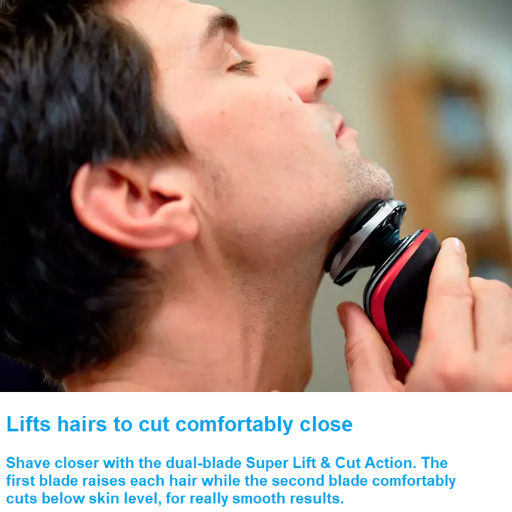 • Cạo sát mà không cắt xước vào da. Hệ thống hai lưỡi lưỡi cạo Super Lift & Cut Action của chúng tôi có các đầu cạo được thiết kế lượn tròn trượt êm ái trên khuôn mặt và bảo vệ làn da.