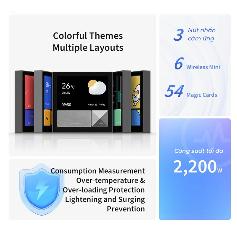- Màn hình LCD 3,95″ cảm ứng đa điểm nhanh nhạy - Màn hình sinh động, tùy chỉnh đa màu sắc với 54 themes - Hiển thị các thông số của nhà như nhiệt độ,
