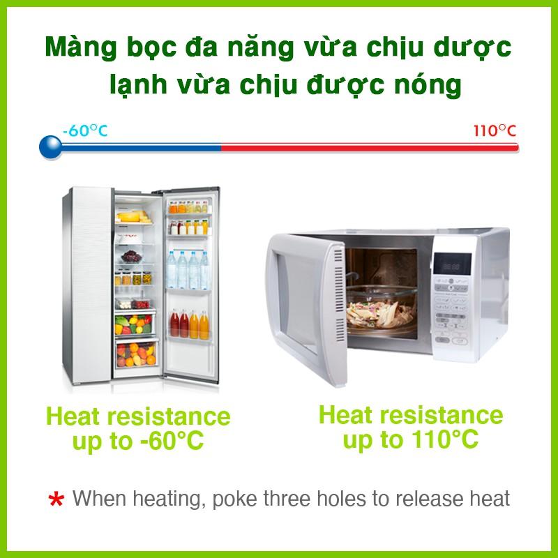 • Màng bọc chắc chắn không bốc mùi: Màng bọc niêm phong kín kể cả chất lỏng, thực phẩm không bốc mùi khi để tủ lạnh.