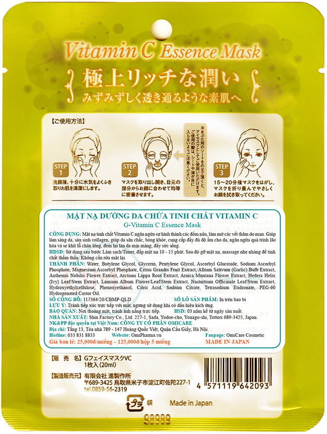 - Bước 4: Đắp mặt nạ trong khoảng 10-15 phút lấy mặt nạ ra, massage nhẹ nhàng 3-5 phút để tinh chất thẩm thấu, rồi rửa lại với nước sạch. OMI PHARMA “Thấu hiểu hơn mỗi ngày” Với 15 năm kinh nghiệm cùng sự hiểu biết sâu rộng về chăm sóc sức khỏe cho thị trường khó tính như Nhật Bản, Omi Pharma đem đến trải nghiệm tuyệt vời nhất về sản phẩm an toàn, hiện đại và tuyệt đối tin cậy.