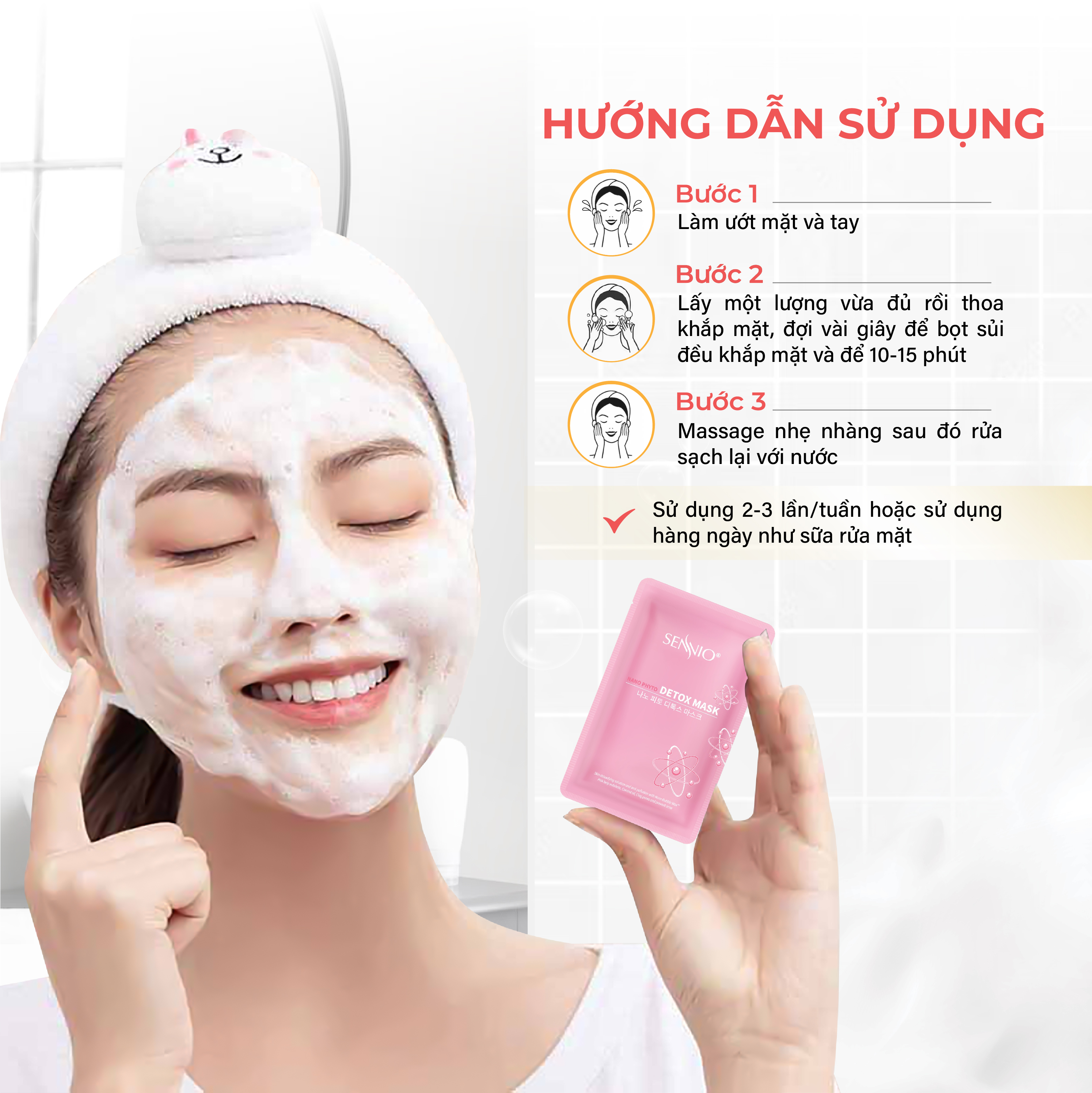- An toàn với mọi làn da, kể cả da dầu mụn, da yếu, da nhạy cảm HƯỚNG DẪN SỬ DỤNG MẶT NẠ SỦI BỌT THẢI ĐỘC DƯỠNG TRẮNG DA SENNIO: