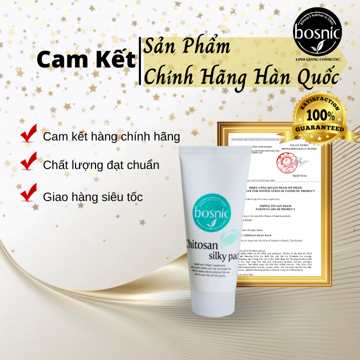 Mua tại TiktokMẶT NẠ Ủ TÓC CHITOSAN SILKY PACK - CHÍNH HÃNG HÀN QUỐC - THƯƠNG HIỆU BOSNIC Mặt Nạ Ủ Tóc Phục Hồi Từ Sâu Bên Trong Đối với chị em phụ nữ, chăm sóc tóc là điều rất cần thiết và là thói quen tốt để giúp cho chúng mình có được một mái tóc hằng mơ ước. Bên cạnh việc dưỡng tóc thì cũng cần chú ý đến việc bảo vệ tóc khỏi các tác nhân gây hại như ánh nắng mặt trời, gió, bụi bẩn, đặc biệt là hóa chất làm tóc. Chính vì vậy, Bosnic đã phát triển ra dòng sản phẩm được xem như bảo vệ tóc khỏi các vấn đề từ môi trường bên ngoài, đồng thời cũng nuôi dưỡng tóc từ sâu bên trong, giúp tái tạo lại các phần tóc bị hư tổn và mang lại sức sống cho mái tóc thân thương. Giới thiệu về thương hiệu: