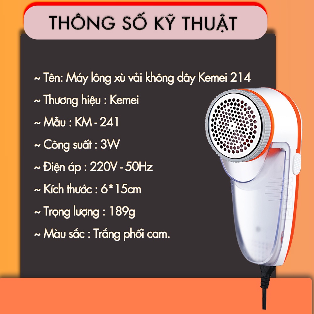 Mua tại TiktokMÁY DUỖI CẮT LÔNG XÙ CHÍNH HÃNG KEMEI KM-241 Trong cuộc sống hằng ngày việc bảo quản quần áo là một việc cần thiết và thiết yếu, giúp bạn tiết kiệm chi phí cho việc mua sắm cũng như giữ quần áo luôn mới, đặc biệt là những món đồ yêu thích. Máy cắt lông xù Kemei KM-241 sẽ là giải pháp cho bà nội trợ thông thái và các thợ may chuyên nghiệp. ƯU ĐIỂM NỔI BẬT : MÁY CẮT LÔNG XÙ ĐIỆN KEMEI KM-241 Thiết kế 3x lưỡi cắt vòng xoay tròn linh hoạt , giúp cho đường cắt sắc bén, chính xác , loại bỏ những vụn vải, lông xù đáng ghét 1 cách nhanh chóng và gọn gàng.