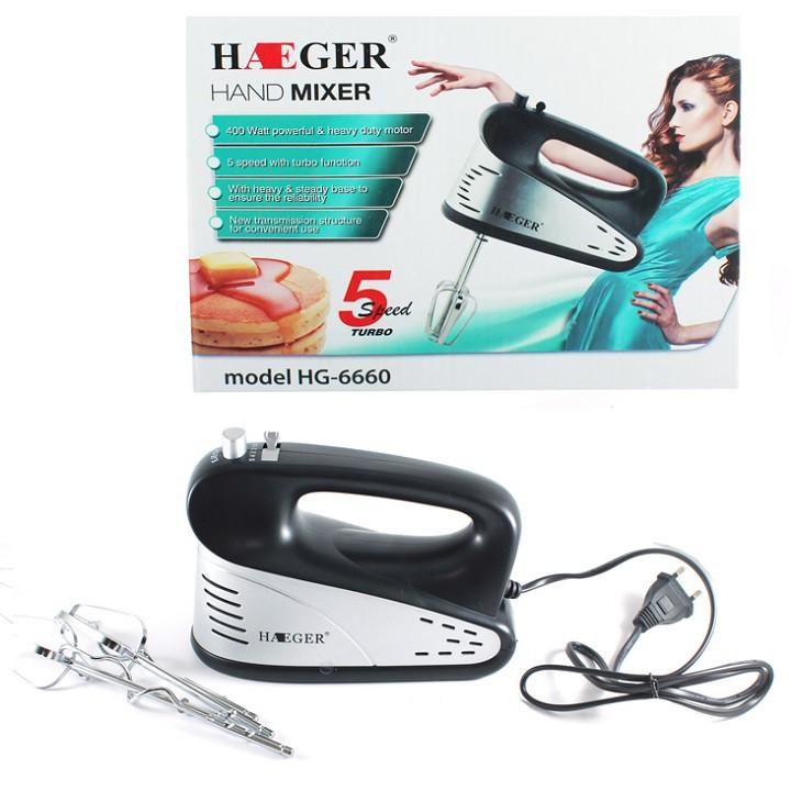 Mua tại TiktokMáy đánh trứng Loại 400w 5 tốc độ giá 259k Máy đánh trứng Loại 500w giá 279k Công việc của chị em phụ nữ giờ đây thật nhẹ nhàng hơn với bộ sản phẩm máy đánh trứng cầm tay đa năng. Thông số và tính năng nổi bật Tên sản phẩm: Máy đánh trứng HAEGER Điện áp: 220V - 50Hz Công suất: 400w - xay và quay đảo An toàn: Bảo vệ kép, chống đổ và chống giật Chất liệu: Thân nhựa ABS, Cây Inox Công dụng: Đánh trứng, quấy bột Mỗi máy đánh trứng gồm có hai bộ que: 2 que đánh trứng và 2 que trộn. Motor 400w khỏe, hiệu quả hơn khi nhào trộn so với các máy khác