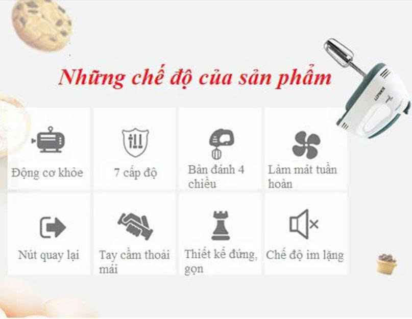 Hoạt động mạnh mẽ với công suất 150W Thiết kế gọn nhẹ, chắc chắn Dễ dàng điều chỉnh với 5 tốc độ Cây đánh làm bằng Inox cao cấp Giúp đánh trứng nhanh, nhuyễn, mịn