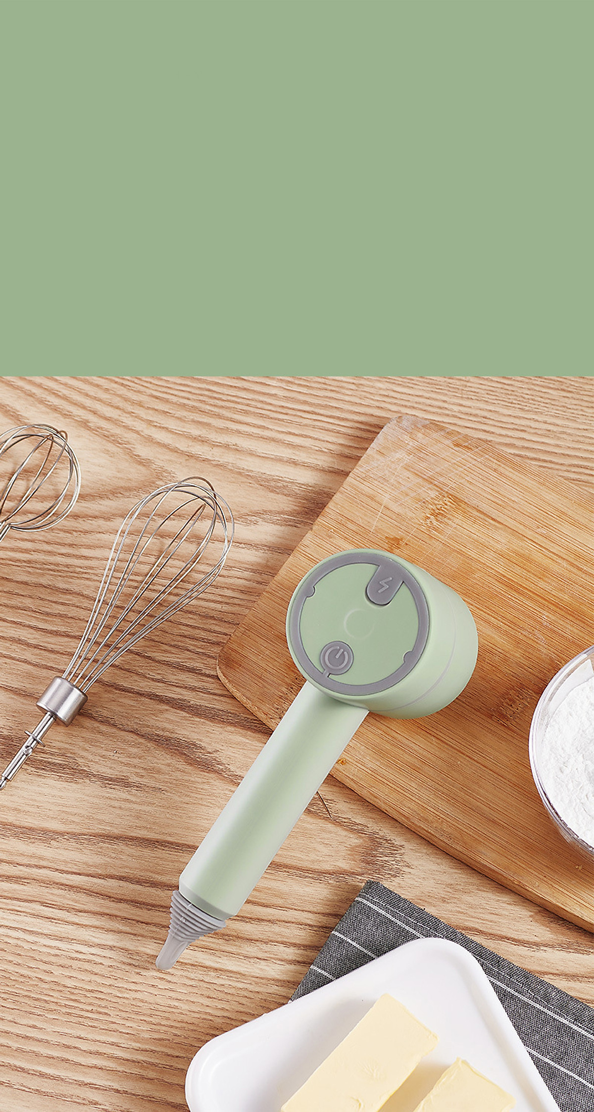 Đi kèm 2 que trộn inox có thể tháo rời để vệ sinh rất dễ dàng và 1 vợt tách lòng đỏ