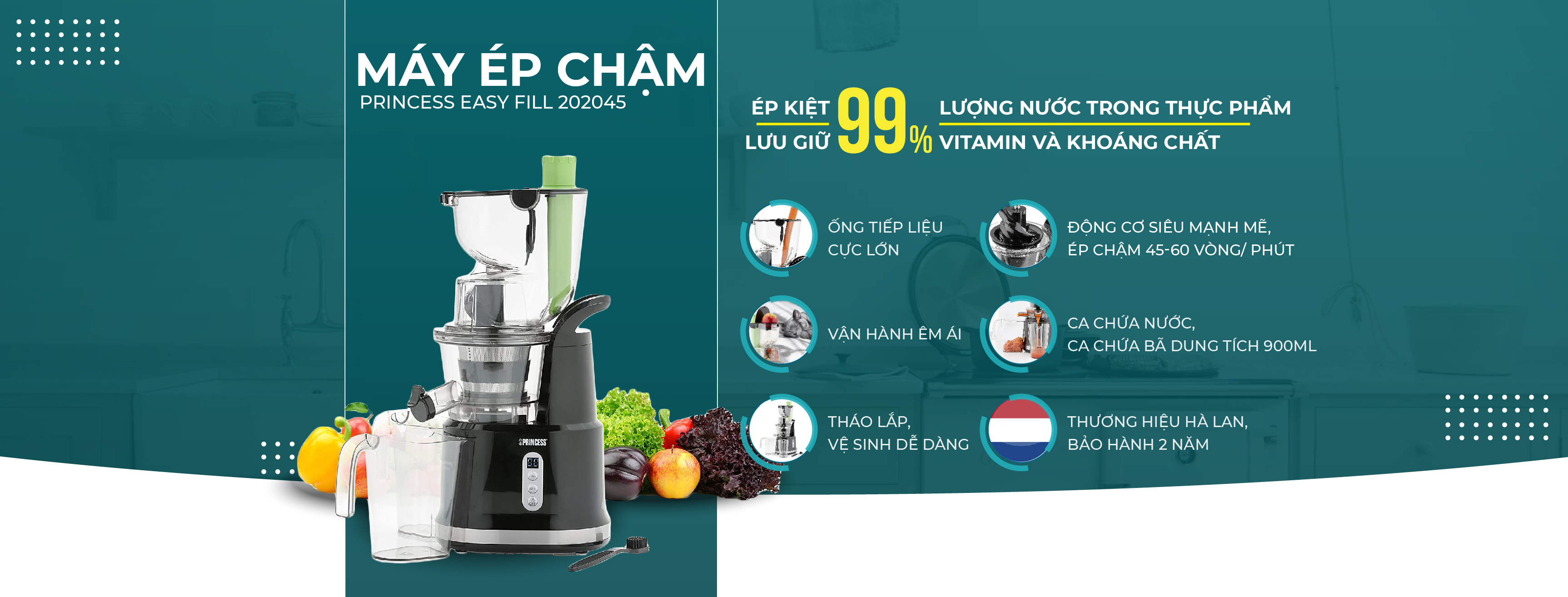 Sử dụng máy ép chậm Princess Easy Fill 202045, bạn có thể ép kiệt 99% lượng nước trong thực phẩm, lưu giữ 99% vitamin và khoáng chất, vượt trội hoàn toàn so với các loại máy ép khác trên thị trường