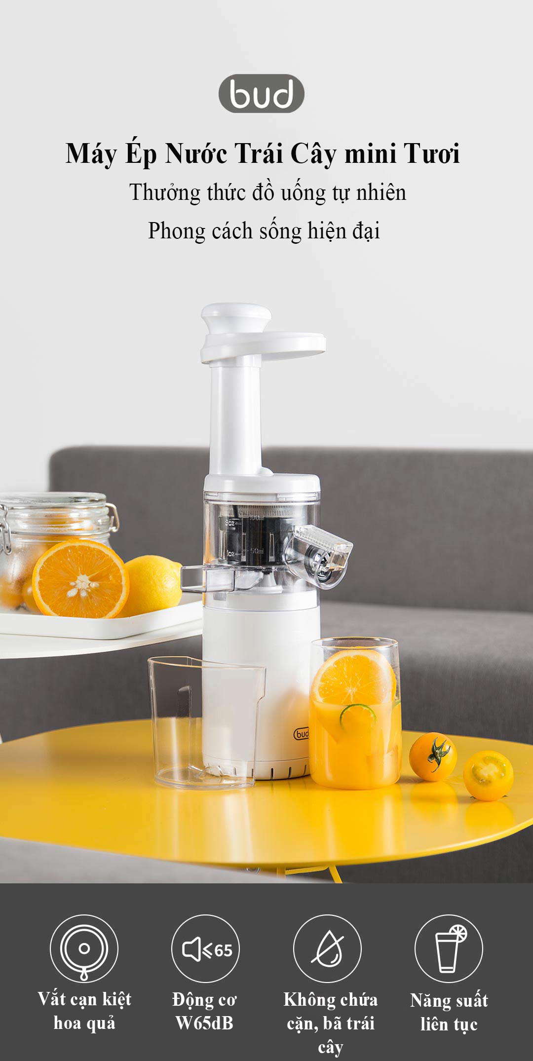Máy Ép Chậm Trái Cây BUD Mini BJ08 - Tách Nước và Bã Ra 2 Phần Khác Nhau - Không Bị Cặn Gì Cả