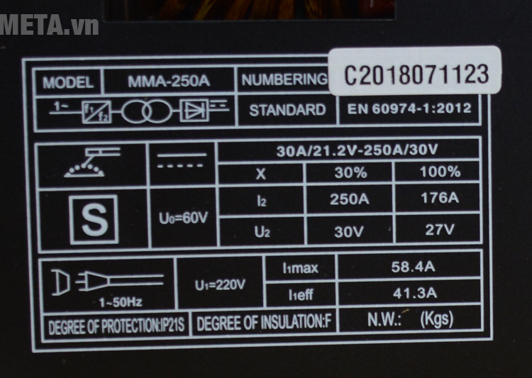 Thông số kĩ thuật như sau Phạm vi điều chỉnh dòng hàn 20A – 200A Công suất 4.6 KVA Nguồn điện áp 220V / 50Hz-60Hz Thương hiệu Nhật Bản Sản xuất tại Trung Quốc