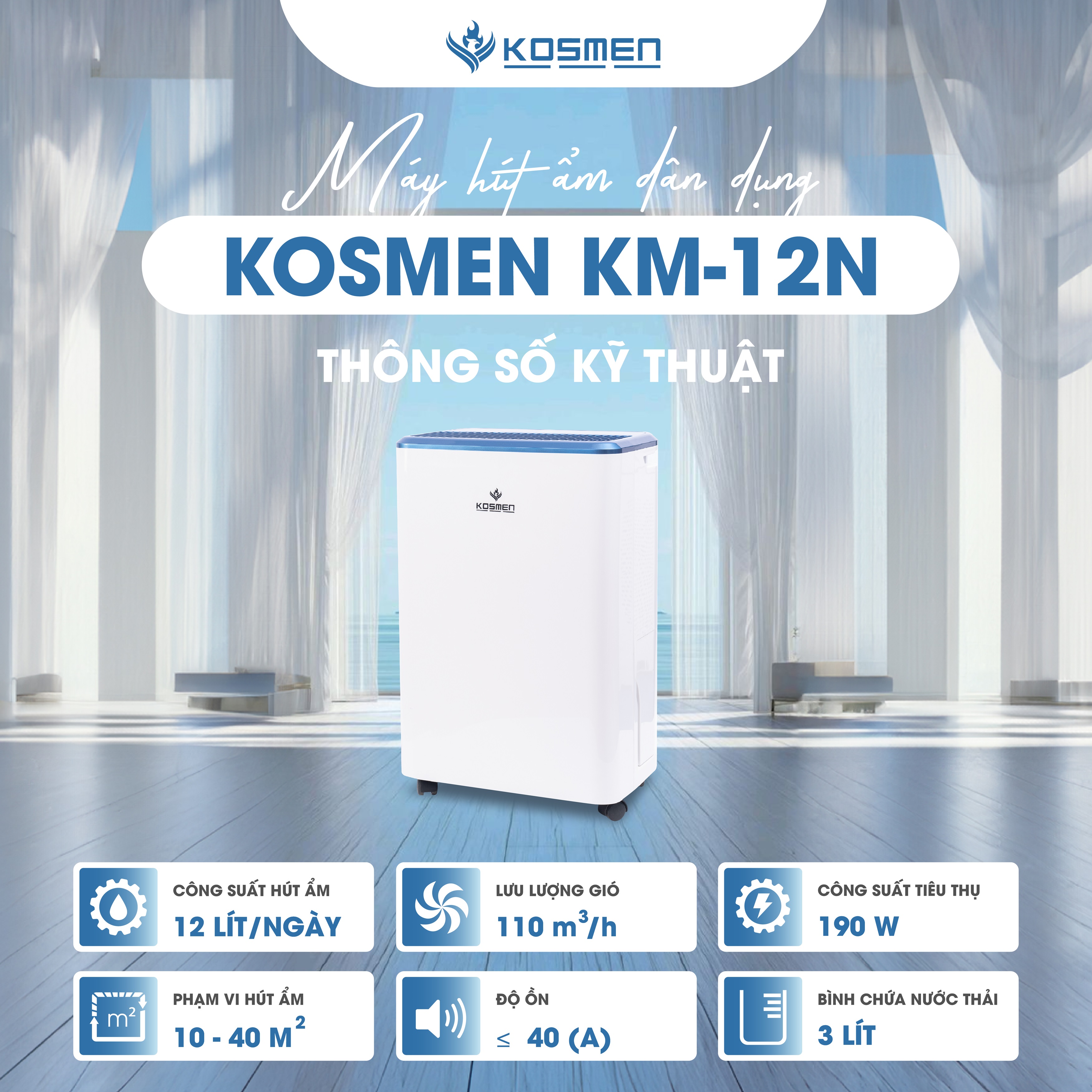 Giới thiệu máy hút ẩm Kosmen KM-12N Máy hút ẩm dân dụng Kosmen KM-12N là dòng sản phẩm nổi bật được nhiều khách hàng ưa chuộng bởi khả năng hút ẩm mạnh mẽ, sử dụng