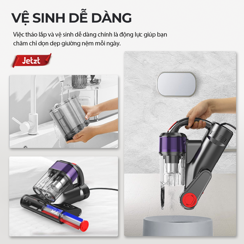 THÔNG SỐ KỸ THUẬT CỦA JETZT J17:   Mã sản phẩm: Jetzt J17 Kích thước sản phẩm: 278mm*240mm*208 mm Điện áp định mức: 22.2V Công suất định mức: 400W Khối lượng tịnh: 1.9kg Điện áp sạc: 220V - 50Hz Dung tích hộp bụi: 0.3L Lực hút: 20.000 PA Chiều dài dây: 5m Độ ồn:  ≤83dB   Để đảm bảo sức khỏe an toàn cho mọi thành viên trong gia đình bạn chắc chắn không thể bỏ qua sản phẩm MÁY HÚT BỤI GIƯỜNG NỆM JETZT J17 với 7 tầng lọc bụi, mang lại khả năng tiêu diệt bụi bẩn, vi khuẩn bám trên giường đệm sạch tới 99%. Với công nghệ diệt khuẩn bằng tia UV, những vết bẩn, vi khuẩn bám lâu ngày sẽ biến mất một cách dễ dàng khi sử dụng JETZT J17.    ĐẶC ĐIỂM SẢN PHẨM:   - MÀN HÌNH LED HIỂN THỊ THÔNG TIN THEO THỜI GIAN THỰC: Trong quá trình hoạt động, bộ cảm biến, thông qua sự điều khiển của con chip thông minh, thể hiện mức độ bụi bẩn qua dải màu hiển thị trên màn hình. Dải màu này sẽ thay đổi màu từ xanh sang đỏ, từ trái sang phải, tương ứng với lượng mạt bụi được giữ lại qua khe hút bụi. Đồng thời, khi động cơ tăng tốc, chỉ số hiển thị tốc độ động cơ cũng đồng bộ tăng lên (tốc độ tối đa đạt 100). Khi lượng mạt bụi trong không khí tăng giảm, dải màu trên màn hình cũng thay đổi từ xanh lam sang đỏ đồng bộ.   - HỆ THỐNG DIỆT KHUẨN ĐA TẦNG:    CÔNG NGHỆ ĐÈN UV DIỆT KHUẨN MẠNH MẼ: Được lắp đặt với hệ thống đèn UV giúp đảm bảo tỷ lệ tiêu diệt rệp, ve, vi sinh vật và vi khuẩn lên đến 99,9%.  CÔNG NGHỆ SÓNG SIÊU ÂM:  Có tác dụng ức chế sự sinh trưởng của các loại ve rệp ẩn sâu dưới các tầng đệm. HỆ THỐNG SẤY NHIỆT 60 ĐỘ : Tăng cường tiêu diệt vi khuẩn, đồng thời giữ cho bề mặt được khô thoáng, tránh ẩm mốc.  7 TẦNG LỌC BỤI: Hệ thống lọc bụi đa tầng giúp loại bỏ mọi bụi bẩn và vi khuẩn    - CON LĂN DIỆT KHUẨN GẮN ĐỘNG CƠ: Con lăn với sợi composite mềm, giúp dễ dàng loại bỏ bụi bẩn trên mặt sàn cứng và kẽ hở trên mặt sàn, chống tình trạng tóc và lông thú cưng bám vào đầu chổi gây tắc nghẽn.   - HỆ THỐNG HỘP LỌC KÉP: Thiết kế hộp bụi kép thông minh với 01 hộp bụi chứa lọc giúp lọc rác và bụi bẩn. Sau đó rác và bụi bẩn này sẽ được lưu trữ tại hộp chứa bụi thứ 02. Thiết kế thông minh này giúp đẩy nhanh quá trình lọc bụi, hỗ trợ làm tăng tuổi thọ của bộ lọc và của toàn bộ máy.   - CẢM BIẾN PHÁT HIỆN THÔNG MINH: Đảm bảo đèn UV tự động tắt khi được nâng lên khỏi bề mặt để ngăn tia UV rò rỉ.   - GIƯỜNG NỆM KHÔNG CHỈ SẠCH MÀ CÒN THƠM: Mặt trong của nắp phía trên của cốc đựng bụi được trang bị hộp đựng viên nén hương liệu có mùi thơm, người dùng có thể chọn các viên nén hương liệu phù hợp với hộp đựng, nhằm giữ cho môi trường trong nhà có hương thơm tươi mát sau mỗi lần sử dụng máy hút bụi. Sau khi tách nắp của cốc chứa bụi ra khỏi cụm cốc chứa bụi theo phương pháp vệ sinh và bảo trì, nhấc nắp hương liệu lên như minh họa trong hình, đặt viên nén hương liệu. Lắp lại cụm nắp trên vào cốc chứa bụi, đặt cốc chứa bụi vào bộ phận chính và tiến hành sử dụng.    CHÍNH SÁCH BẢO HÀNH