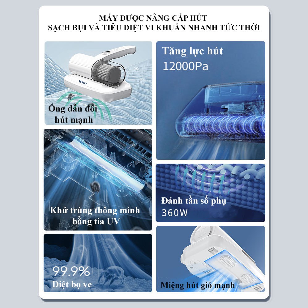 Mua tại TiktokMáy hút bụi giường nệm REKKY công nghệ diệt khuẩn thông minh bằng tia UV với hệ thống lọc đa tầng RE002W LỖI 1 ĐỔI 1 MIỄN PHÍ TẠI NHÀ, BẢO HÀNH 12 THÁNG THÔNG SỐ KỸ THUẬT CỦA MÁY HÚT BỤI GIƯỜNG NỆM REKKY: