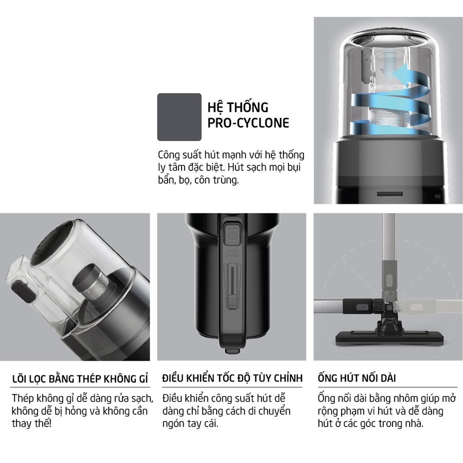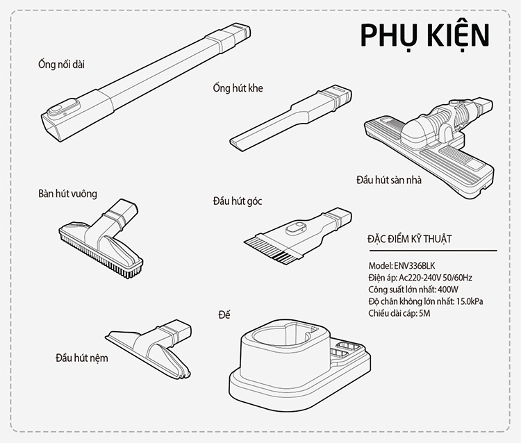 Mua tại TiktokHệ thống Pro-cyclone Máy Hút Bụi Lock&Lock ENV336BLK (400W) có công suất hút mạnh với hệ thống ly tâm đặc biệt. Hút sạch mọi bụi bẩn, bọ, côn trùng. Điều khiển tốc độ tùy chỉnh Điều khiển công suất hút dễ dàng chỉ bằng cách di chuyển ngón tay cái. Ống hút nối dài Ống nối dài bằng nhôm giúp mở rộng phạm vi hút và dễ dàng hút ở các góc trong nhà. Lõi lọc bằng thép không gỉ Thép không gỉ dễ dàng rửa sạch, không dễ bị hỏng và không cần thay thế! Các loại đầu hút linh hoạt Nhiều loại đầu hút để làm sạch mọi ngóc ngách và bề mặt: Bàn hút sàn nhà, Đầu hút góc, Ống hút khe, Đầu hút nệm, Bàn hút vuông với bàn chải nylon. Lưu ý: Trong đó các sản phẩm sử dụng pin sạc, các lỗi về pin sẽ được áp dụng chính sách bảo hành 12 tháng.