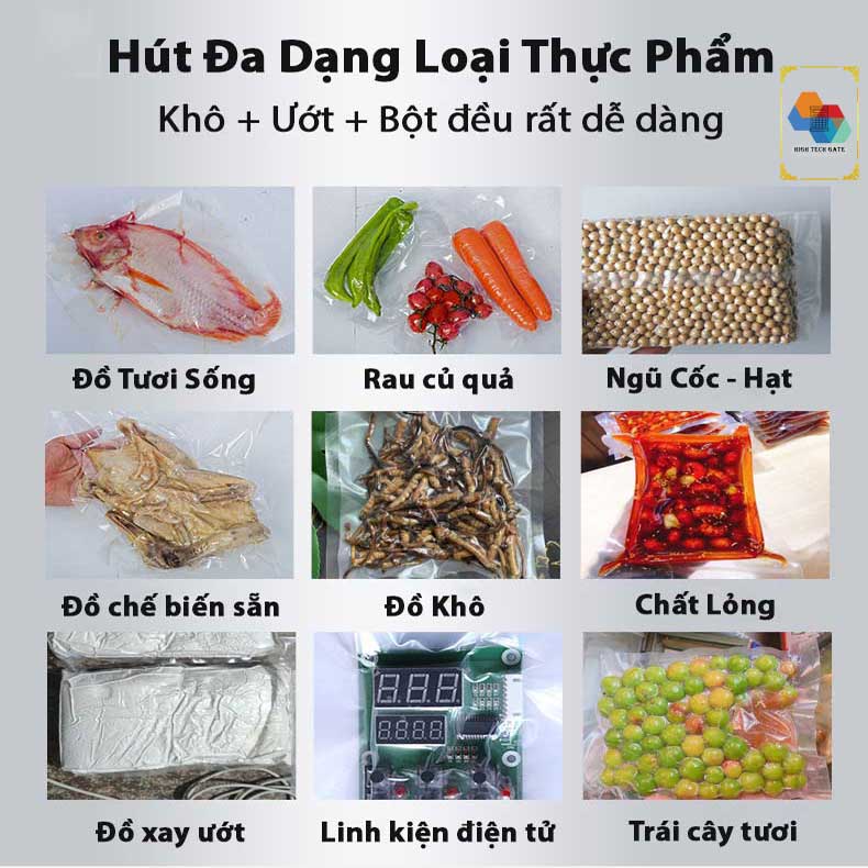 Hút chân không thực phẩm là một phương pháp tuyệt vời để lưu trữ nhiều loại sản phẩm, đặc biệt là thực phẩm, thịt, cá, rau, quả, nông sản, gạo, hạt điếu, tiêu, đậu… Các