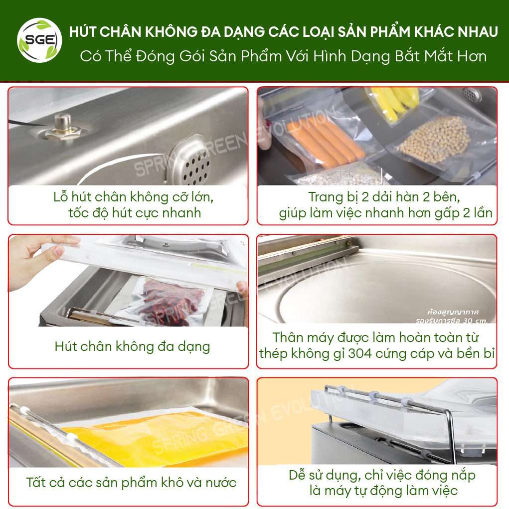 Máy hút chân không đa di năng nhất ở thời điểm hiện tại Buồng hút rộng rãi, hút được đủ mọi thể loại Hút chân không cả đồ khô và đồ có nước. Hai dải hàn hai bên, cực kì năng suất Sử dụng kết hợp được với mọi loại túi. Giảm chi phí đầu tư đến hơn 50% Có thể tùy chỉnh thời gian hàn – hút – nghỉ. Lực hút cực mạnh, đảm bảo không rò rỉ Dải hàn rộng đến 8mm, hàn miệng túi cực kì chắc chắn Nắp máy acrylic trong suốt, chắc chắn và dễ quan sát Lỗ hút chân không cỡ lớn, tốc độ hút cực nhanh MÁY HÚT CHÂN KHÔNG SGE TỐT NHƯ NÀO? Nhà máy sản xuất theo đúng tiêu chuẩn ISO9001, ISO14001 và OHAS18001