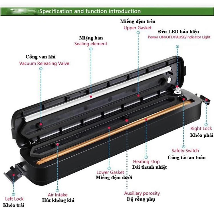 - MÁY CÓ 2 CHẾ ĐỘ: Hút sau đó hàn( dùng với TÚI 1 MẶT NHÁM) Chỉ hàn( dùng được cho mọi loại túi) CÁCH HÚT CHÂN KHÔNG ĐƠN GIẢN VỚI MÁY HÚT CHÂN KHÔNG GIA ĐÌNH VACUUM SEALER Sản phẩm tiện dụng cho gia đình và rất dễ sử dụng, chưa đầy 15 giây là bạn đã có thể đóng gói sản phẩm tốt nhất. Bước 1: Mở lắp cài khóa 2 bên của máy, sau đó cho túi hút đưng thực phẩm vào trong khoang máy(Để miệng túi phẳng, vòi hút ở giữa 2 miệng túi( không được che vòi hút) Bước 2: Cài khóa hai bên nắp máy hút, ẤN TAY LÊN THÂN MÁY và bấm nút “nguồn” máy màu xanh sẽ tự động hút sạch không khí bên trong bao bì.( Bước 3: Sau khi đèn trạng thái bên tay phải chuyển sang màu đỏ, nhấc nhẹ núm cao su bên tay trái của máy NHỮNG ĐIỀU CẦN CHÚ Ý KHI SỬ DỤNG MÁY ÉP CHÂN KHÔNG VACUUM SEALER 1: Không sờ vào bộ phận hàn túi của máy hút chân không khi đang cắm điện 2: Không sử dụng các chất tẩy rửa mạnh 3: Không để máy bị ướt khi mưa hoặc vào nước. 4:Không để các nguồn nhiệt nóng lên trên máy 5: Tránh xa tầm tay trẻ em. 6: Máy không hút nước, không hút thực phẩm dạng bột.