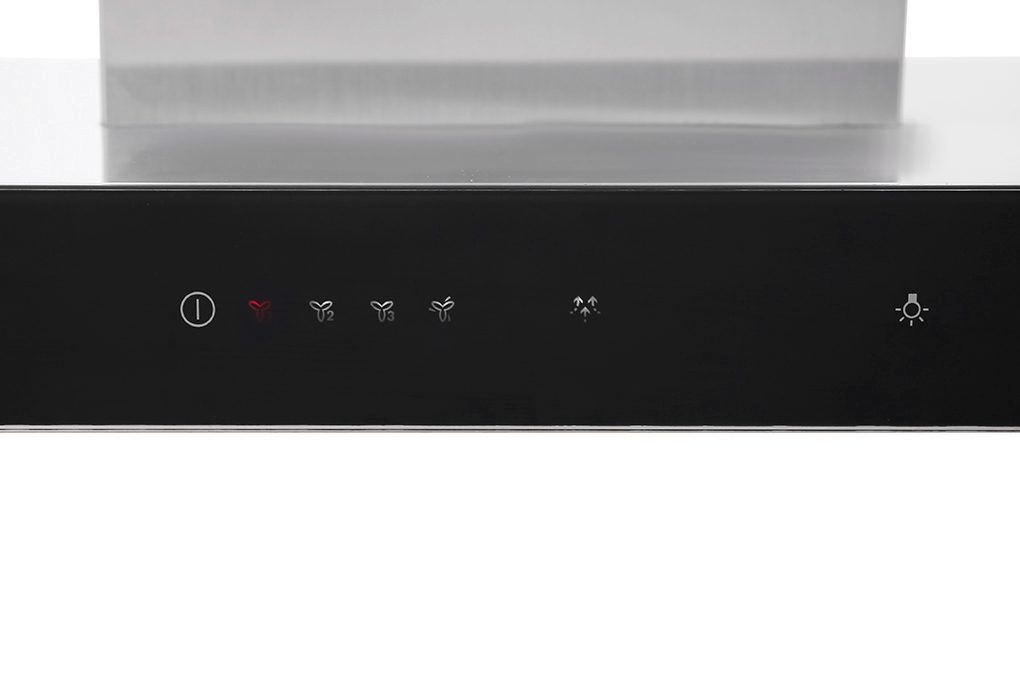 Chất liệu Inox-Kính Điều khiển cảm ứng 4 tốc độ + Hẹn giờ Màn hình hiển thị LCD Ống thoát Ø 150mm Đèn Led tiết kiệm điện:2x3W Bộ lọc than hoạt tính và 1 lưới
