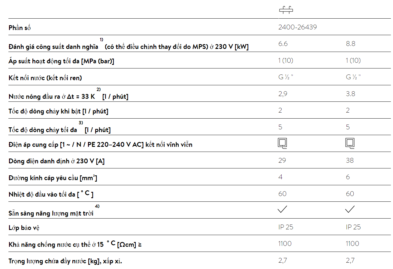 Thông số kỹ thuật cơ bản CÓ BƠM/KHÔNG CÓ BƠM Bơm DC LOẠI Màn hình LCD Nguồn điện 220 V, 50 Hz Công suất định mức 4,5 kW Áp lực nước Tối thiểu 0,05 kgf/cm²