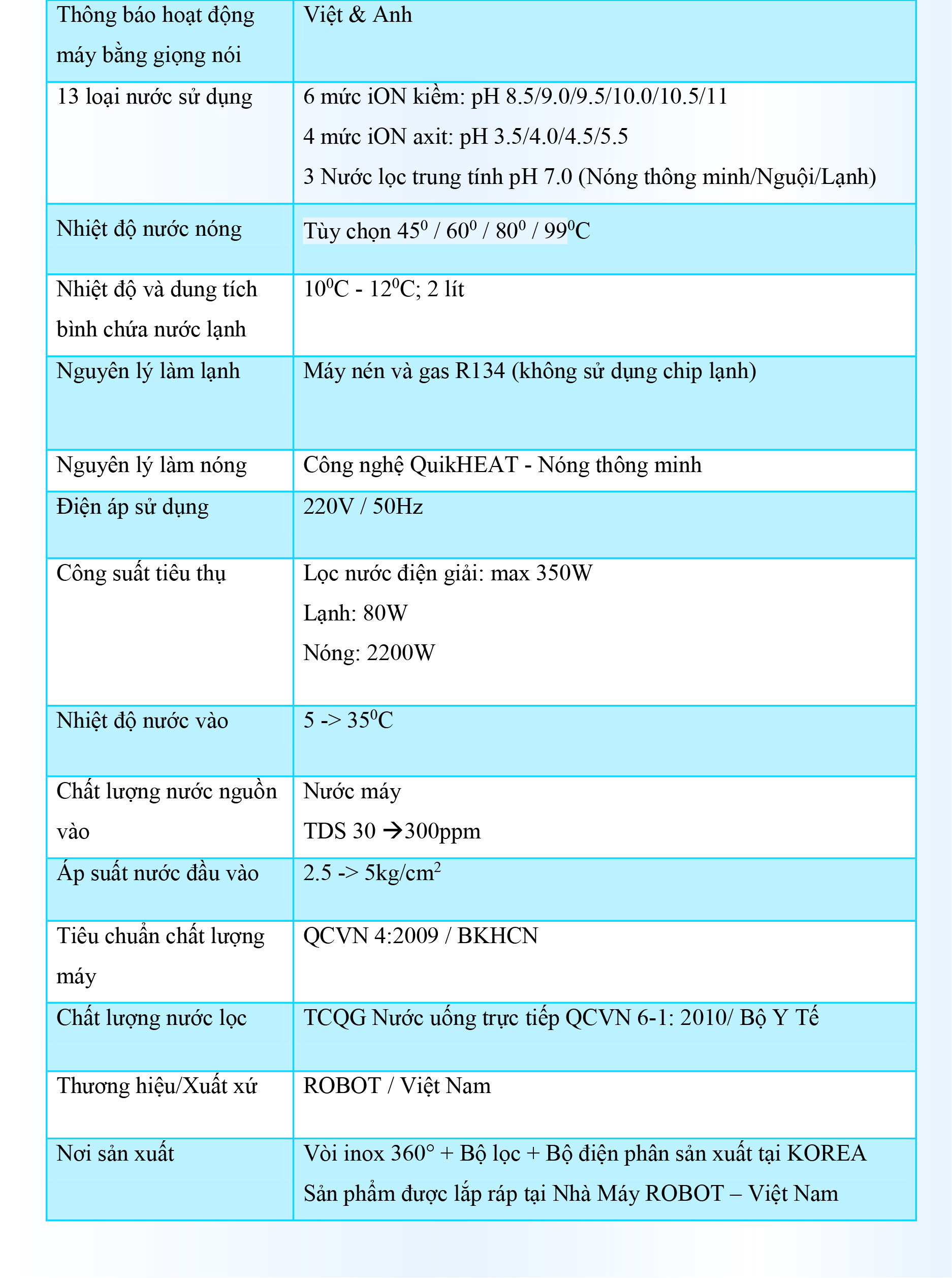 - Máy lọc nước điện giải iON kiềm ROBOT ionKing 1113 là sản phẩm được sản xuất với công nghệ tiên tiến, cao cấp trang bị đến 11 tấm điện cực lớn nhất, có khả năng tạo ra đến 13 loại nước đa chức năng, với 6 mức nước iON kiềm (pH 8.5 11.0), nước lọc trung tính (pH 7.0) Nguội – Nóng – Lạnh & 4 mức nước iON axit (pH 3.5 - 5.5). Chất lượng nước đạt chỉ số tối ưu, nồng độ Hydro hoạt tính lên đến ~ 1500 -> 1800 ppb, chống oxy hóa (ORP) lên đến ~ -850 -> -1000 mV, đáp ứng mọi nhu cầu sử dụng trong cuộc sống.
