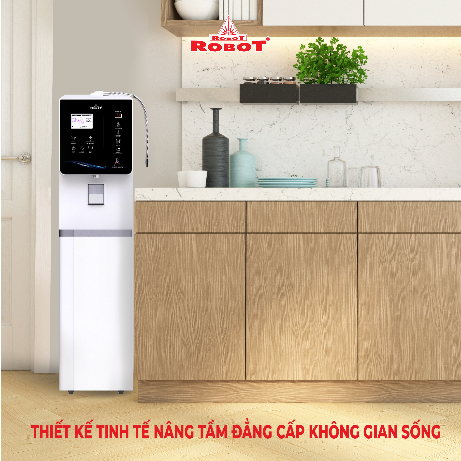 - Và 3 mức nước iON axit (pH 4.5/5.0/5.5). Chất lượng nước đạt chỉ số tối ưu, nồng độ Hydro hoạt tính lên đến ~ 750 -> 850 ppb, chống oxy hóa (ORP) lên đến ~ -350 -> -500 mV, đáp ứng mọi nhu cầu sử dụng trong cuộc sống. Máy lọc nước điện giải iON kiềm Nóng Lạnh ROBOT ionKing là dòng Tủ Đứng đầu tiên trên thế giới, được thiết kế kiểu dáng hiện đại, thiết kế chinh phục mọi không gian. Đặc biệt, được tích hợp thêm chức năng Nóng Thông Minh – Lạnh độc đáo & duy nhất trên thị trường, mang lại nhiều tiện ích cho người dùng. Chỉ số Hydrogen, ORP của nước tùy thuộc số tấm điện cực, đặc tính nguồn nước & “điều kiện đo trong phòng thí nghiệm chuyên nghiệp, đạt chuẩn”. Máy lọc nước điện giải iON kiềm Nóng Lạnh ROBOT ionKing 511, tạo 11 loại nước bổ ích, pH 4.5 --> 10.5 - Đáp ứng mọi nhu cầu trong cuộc sống Có thể tham khảo ý kiến của Bác sĩ hoặc chuyên gia dinh dưỡng để được hướng dẫn loại nước uống phù hợp nhất cho cơ thể. Kiểu dáng hiện đại - Thiết kế chinh phục mọi không gian
