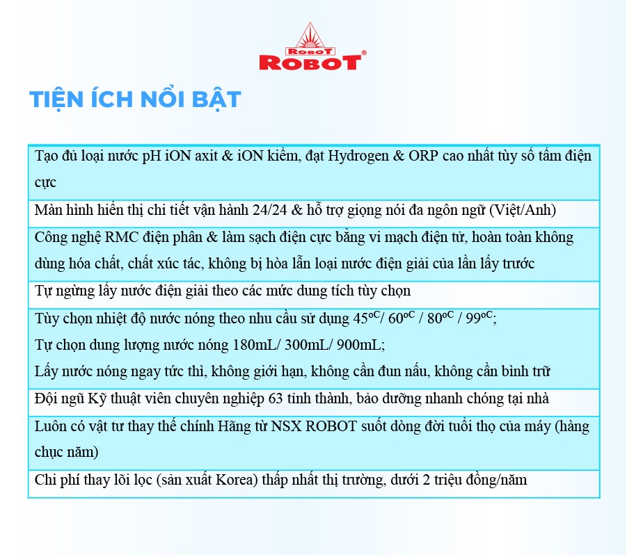 Với mong muốn nhiều gia đình Việt có thể sử dụng nước điện giải iON kiềm với chi phí hợp lý để bảo vệ sức khỏe, sắc đẹp & nâng cao chất lượng cuộc sống, ROBOT mang đến sản phẩm “Chất lượng Quốc tế - Giá thành Việt Nam”, phù hợp với mức sống của nhiều người. Tiết kiệm cho người tiêu dùng đến hơn một nửa chí phí so với máy nhập khẩu chỉ từ 30 – 50%, nhưng sở hữu nhiều ưu điểm, tính năng vượt trội, chất lượng cao.