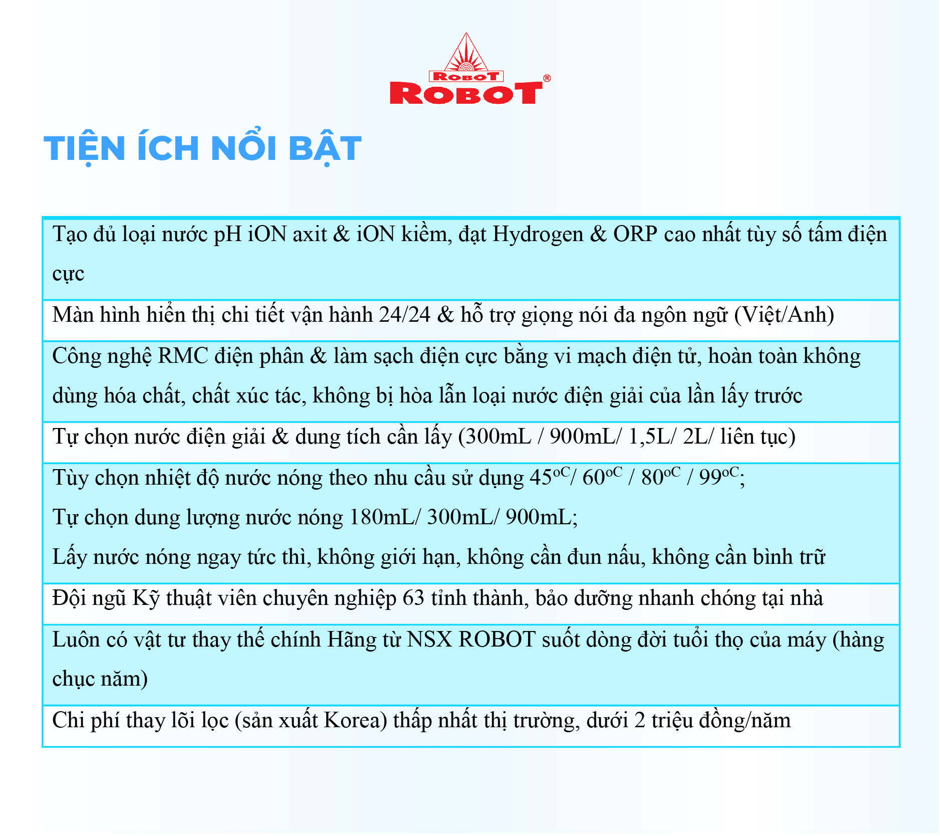 Với mong muốn nhiều gia đình Việt có thể sử dụng nước điện giải iON kiềm với chi phí hợp lý để bảo vệ sức khỏe, sắc đẹp & nâng cao chất lượng cuộc sống, ROBOT mang đến sản phẩm “Chất lượng Quốc tế - Giá thành Việt Nam”, phù hợp với mức sống của nhiều người. Tiết kiệm cho người tiêu dùng đến hơn một nửa chí phí so với máy nhập khẩu chỉ từ 30 – 50%, nhưng sở hữu nhiều ưu điểm, tính năng vượt trội, chất lượng cao.