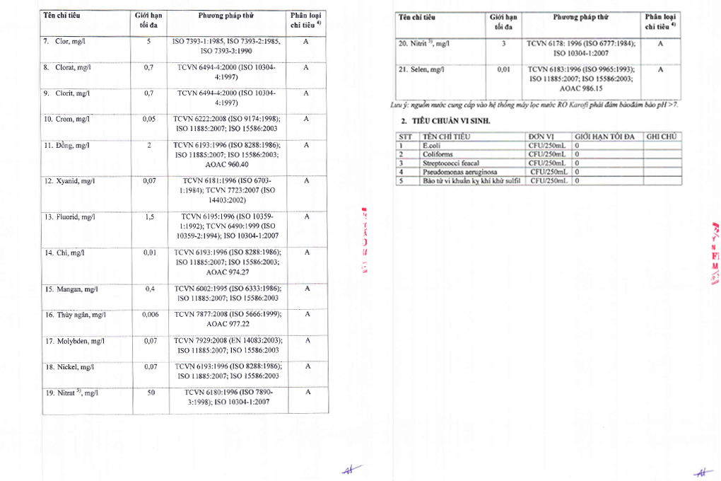 Đạt chuẩn Quốc gia nước uống trực tiếp QCVN6-1:2010/BYT Vượt qua mọi quy trình kiểm tra nghiêm ngặt về chất lượng nước sau lọc và chất lượng  dùng trong sinh hoạt gia đình, Karofi là đơn