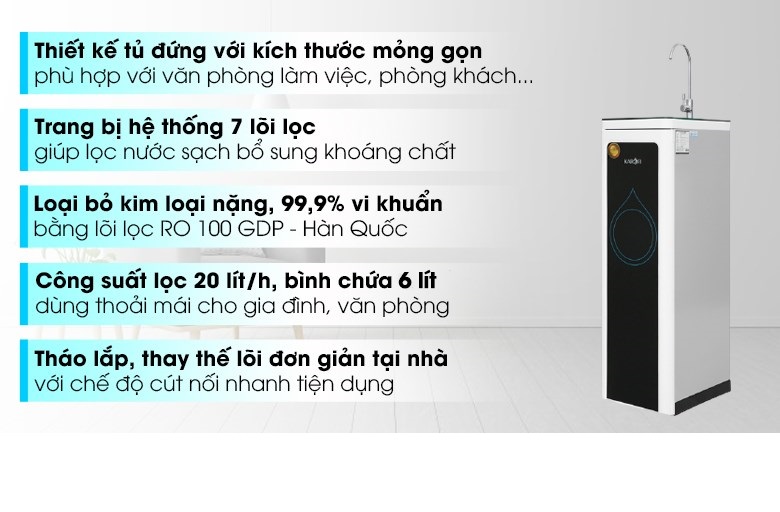 Đặc điểm sản phẩm Kiểu lắp đặt:Tủ đứng Loại máy: Máy lọc nước R.O Công nghệ lọc: Thẩm thấu ngược RO Số lõi lọc: 7 lõi Lõi lọc thô: Lõi 1: PP 5 micron (Sx Việt Nam) Lõi 2: OCB-GAC (Sx Việt Nam) Lõi 3: PP 1 micron (Sx Việt Nam) Lõi RO/Nano/UF: RO 100 GPD sản xuất Hàn Quốc Lõi chức năng: Lõi 6: Mineral (Sx Việt Nam) Lõi 7: Nano Bạc (Sx Việt Nam) Dung tích bình chứa: 8.5 lít Tỉ lệ lọc - thải: Lọc 6 - Thải 4 Công suất lọc nước: 20 lít/ giờ Công suất tiêu thụ điện trung bình khoảng: 0.024 kw/h - 0.03 kw/h Hệ thống bơm và van điều tiết: Bơm - hút 2 chiều Tiện ích: Chế độ cút nối nhanh dễ dàng thay lõi Tự động xả nước thải Trung hòa độ PH ổn định độ ngọt cho nước Ngừng hoạt động khi nước đầy bình Thông tin lắp đặt Kích thước, khối lượng: Ngang 29 cm - Cao 90 cm - Sâu 34 cm - Nặng 18 kg Thương hiệu: Việt Nam Nơi sản xuất: Việt Nam   Hãng: Karofi Máy lọc nước Karofi thiết kế dạng tủ đứng sang trọng, vỏ sáng bóng, đẹp mắt góp phần làm tăng tính thẩm mỹ cho không gian sống Trang bị 7 lõi lọc, màng lọc RO xuất xứ Hàn Quốc cho nguồn nước sau lọc sạch trong, tinh khiết, tốt cho sức khỏe