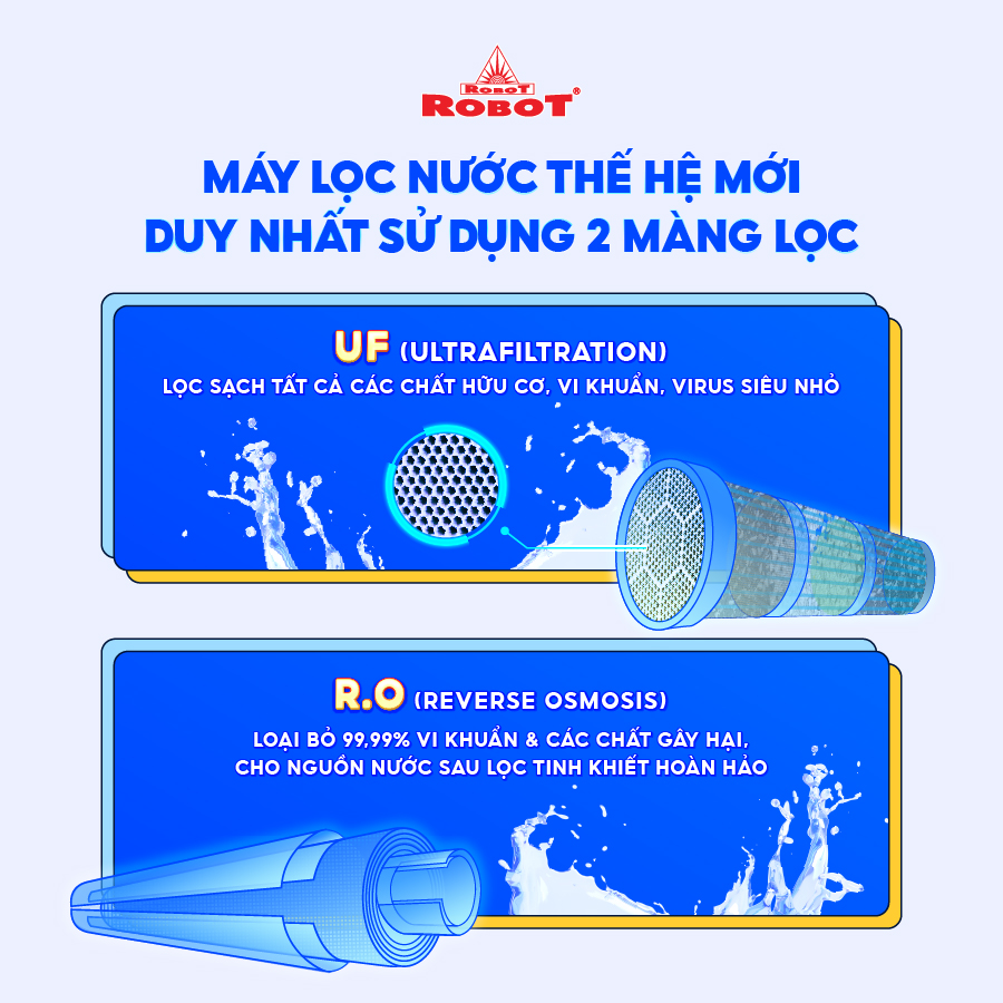 - Máy được tích hợp 2 công nghệ lọc tối ưu nhất hiện nay là UF (Ultrafiltration) & R.O (Reverse Osmosis) cho nguồn nước sau lọc sạch tối đa, được loại bỏ hoàn toàn cặn bẩn hay chất gây hại. Hệ thống đa cấp lọc mạnh mẽ của ROBOT RENO PRO 239G-UR