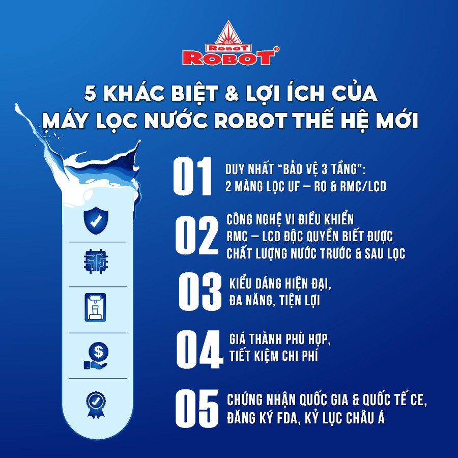 • Công nghệ RMC – LCD độc quyền, biết được chất lượng nước trước & sau lọc     Bộ vi mạch RMC-LCD thông minh thiết kế phát minh của ROBOT, mọi chi tiết vận hành máy được hiển thị trên màn hình LCD, cảnh báo mọi rủi ro cho người sử dụng   Tuổi thọ lõi lọc được tính theo lưu lượng nước sử dụng, không tính theo thời gian ghim điện như các máy thông thường, tiết kiệm tối đa chi phí thay lõi lọc