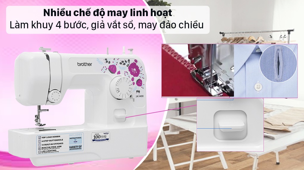 14 đường may cùng nhiều chức năng tự động thông minhMáy May Brother JA1400 có sẵn 14 mũi đường may cơ bản, may được loại chỉ thẳng đơn giản, mũi ziczac và nhiều mũi trang trí khác.Ngoài ra máy còn h...
