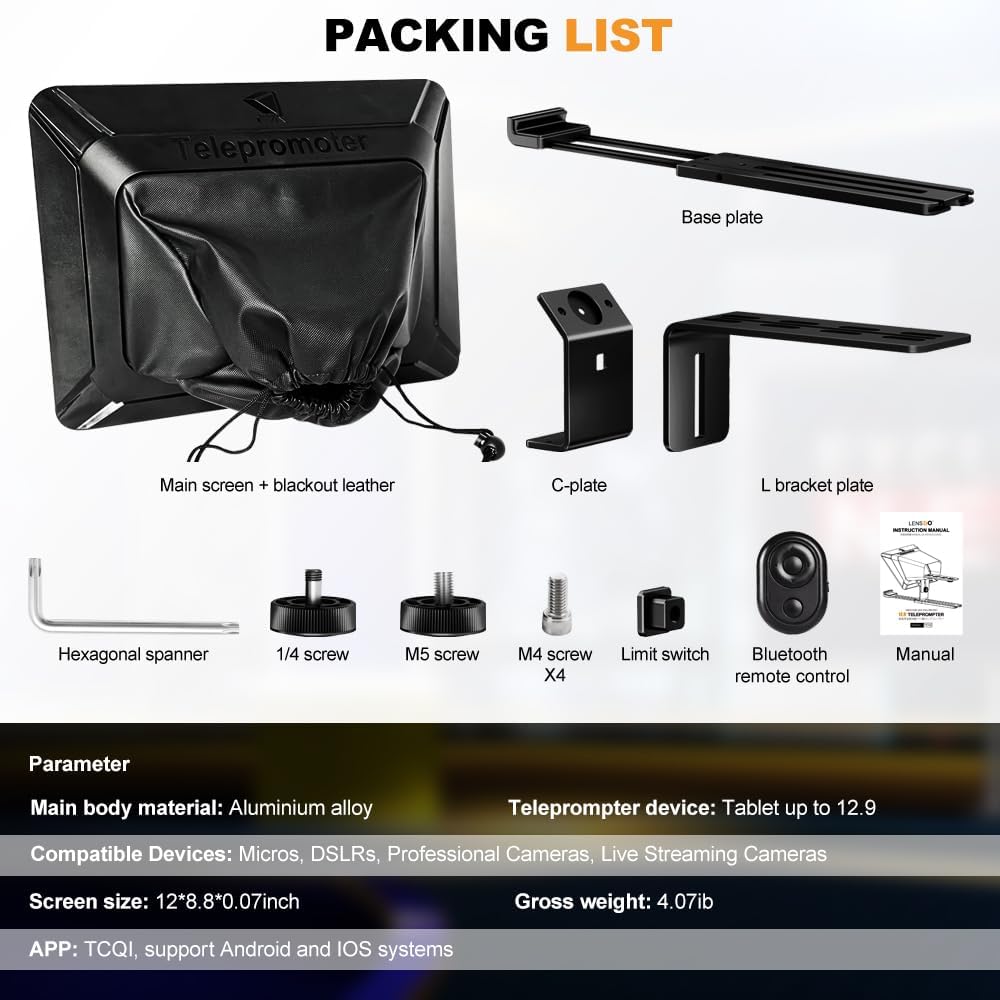 Máy nhắc chữ Lensgo TC12 thiết kế chắc chắn cứng cáp từ hợp kim nhôm, tháo lắp dễ dàng, kính phân tách chùm tia trong suốt 12 inch, khả năng truyền sáng 70% giúp phản chiếu rõ nét, hỗ trợ chụp ngang/ dọc với góc chụp rộng, tương thích với nhiều dòng máy tính bảng cỡ lớn, nhắc chữ thông qua ứng dụng với điều khiển bluetooth, thích hợp để phỏng vấn, làm vlog, quay phát trực tiếp,...