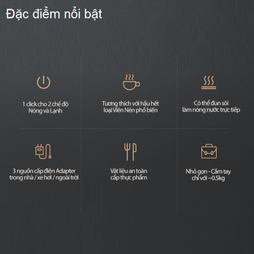 - Tính năng: Pha nóng và lạnh, sử dụng với cà phê bột và viên nén, tương thích 3 nguồn cấp