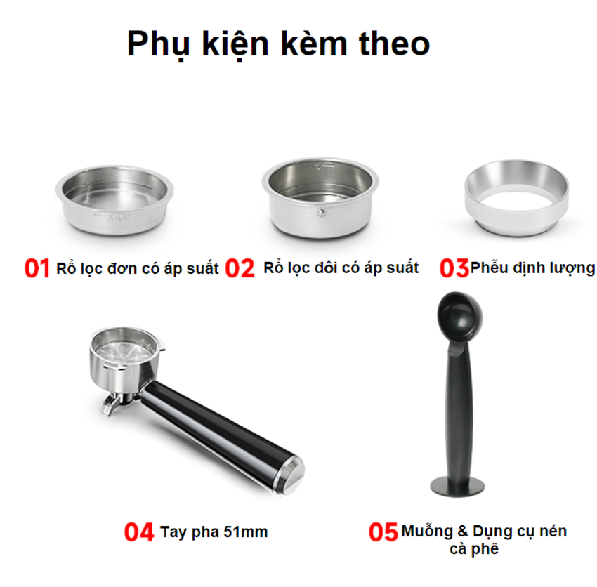- Bộ phụ kiện bao gồm: 1 máy chủ; 1 tay pha 51mm ; x2 phin lọc inox ; 1 tay nén kiêm thìa; 1 phễu định lượng; 1 sách HDSD
