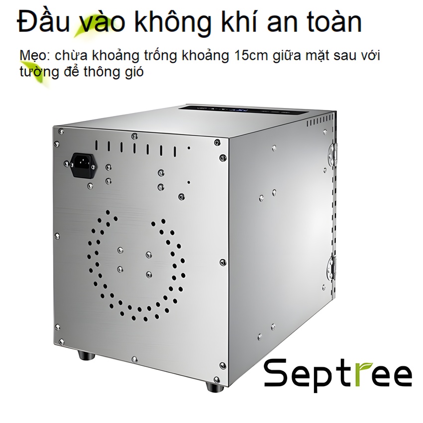 - Bộ gia nhiệt và điện trở nằm ở phía sau cùng, tiếp đến sẽ là quạt gió. Quạt gió vừa có tác dụng hút không khí vào trong, vừa có tác dụng tản nhiệt và thổi hơi nước thừa ra bên ngoài. Đây là chu trình tuần hoàn có sự chuyển tiếp và hỗ trợ qua lại, giúp thực phẩm khô nhanh hơn, khắc phục được tình trạng hút ẩm ngược ở các phương pháp sấy thủ công. Máy sấy hoa quả thực phẩm Septree DBC-08A01 có giải nhiệt độ sấy rộng, thời gian sấy liên tục lên đến 24h