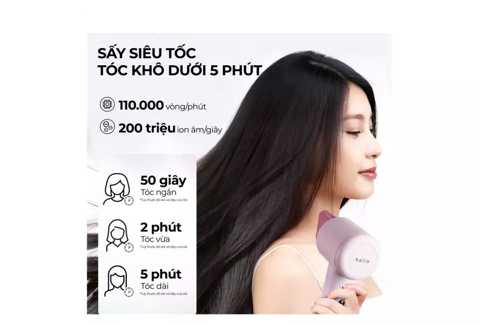 Cùng khám phá máy sấy Halio High Speed Ionic được trang bị động cơ mạnh mẽ với tốc độ lên đến 110,000 vòng/phút giúp tóc khô nhanh gấp đôi so với các loại máy sấy tóc thông