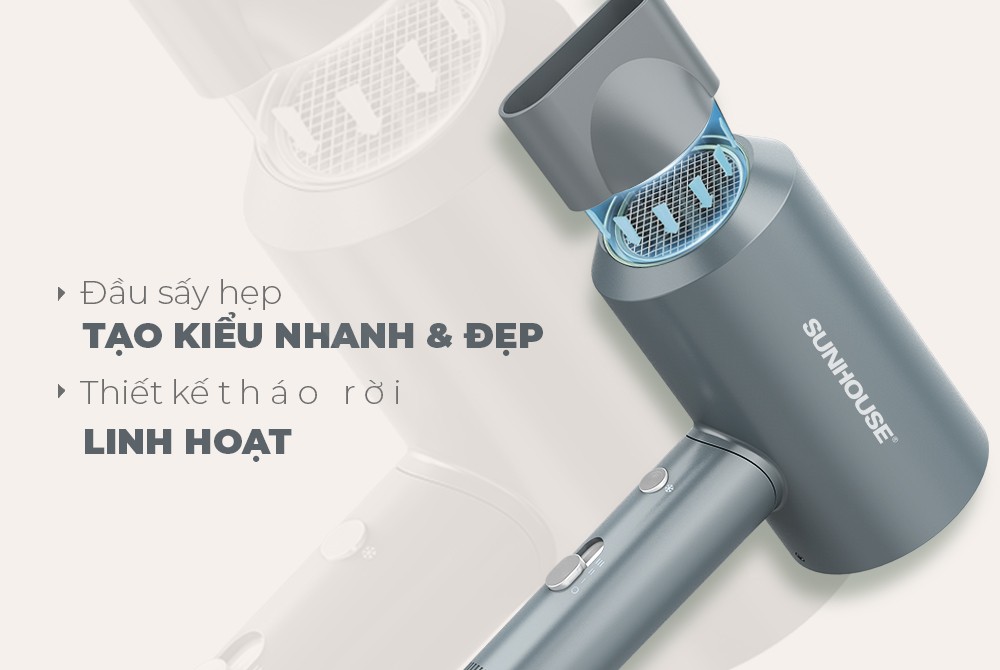 - Đầu sấy tháo lắp linh hoạt, tiện lợi Máy sấy tóc SUNHOUSE SHD2315G công suất lớn lên đến 2000W giúp tóc nhanh khô. Sản phẩm còn có đầu sấy hẹp tạo luồng khí mạnh và tập trung giúp bạn tạo kiểu tóc nhanh và đẹp hơn. Với 3 tốc độ gió tùy chỉnh linh hoạt, đặc biệt là chế độ sấy mát, SUNHOUSE SHD2315G giúp chăm sóc tóc tốt hơn, giảm hư tổn. KIỂU DÁNG SANG TRỌNG, DỄ DÀNG SỬ DỤNG