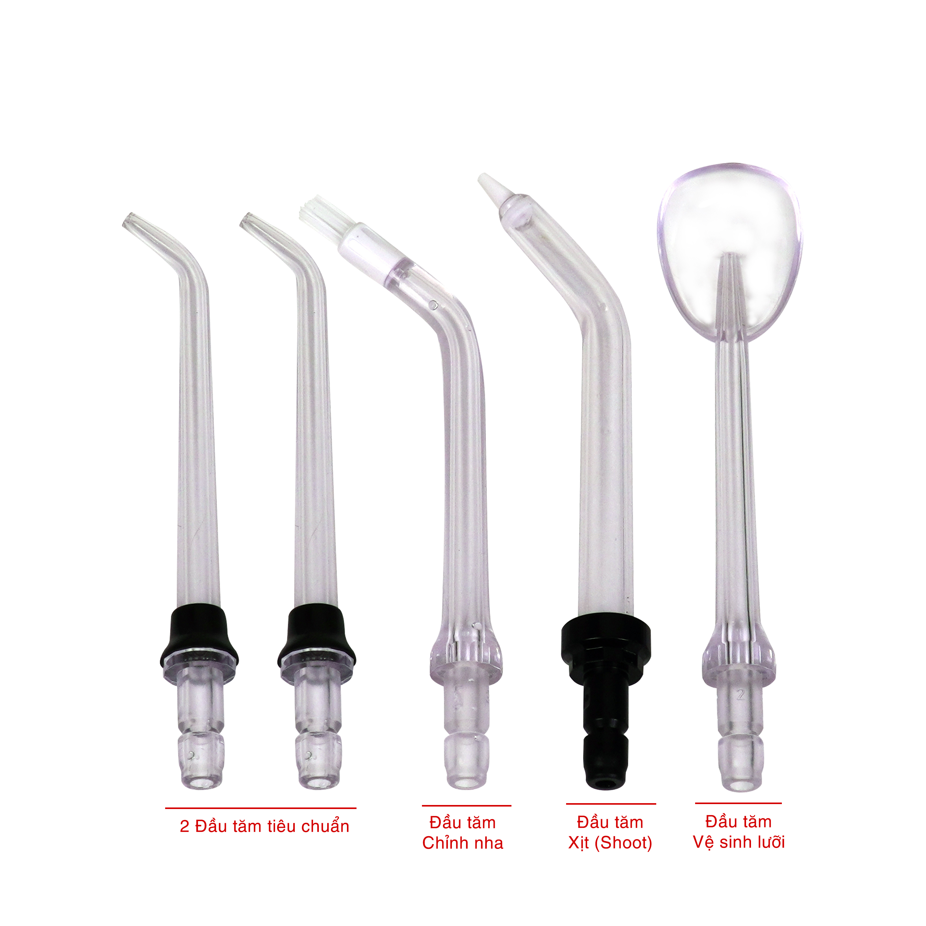 - Cổng sạc USB tiện lợi: Tăm nước được trang bị cổng sạc USB, cho phép bạn dễ dàng sạc pin ở bất kỳ đâu, bất kỳ lúc nào, chỉ cần có kết nối USB. 5 đầu tăm đi kèm: Sản phẩm đi kèm 5 đầu tăm khác nhau, bao gồm 2 đầu tiêu chuẩn, 1 đầu vệ sinh nướu, 1 đầu chỉnh nha và 1 đầu vệ sinh lưỡi. Đầu tăm có thể xoay 360 độ, giúp tiếp cận và làm sạch mọi ngóc ngách trong khoang miệng.