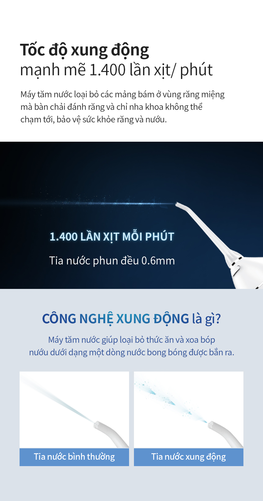 Với 3 loại đầu tăm chuyên dụng, máy phù hợp với tất cả nhu cầu và tình trạng rặng miệng của mỗi người.