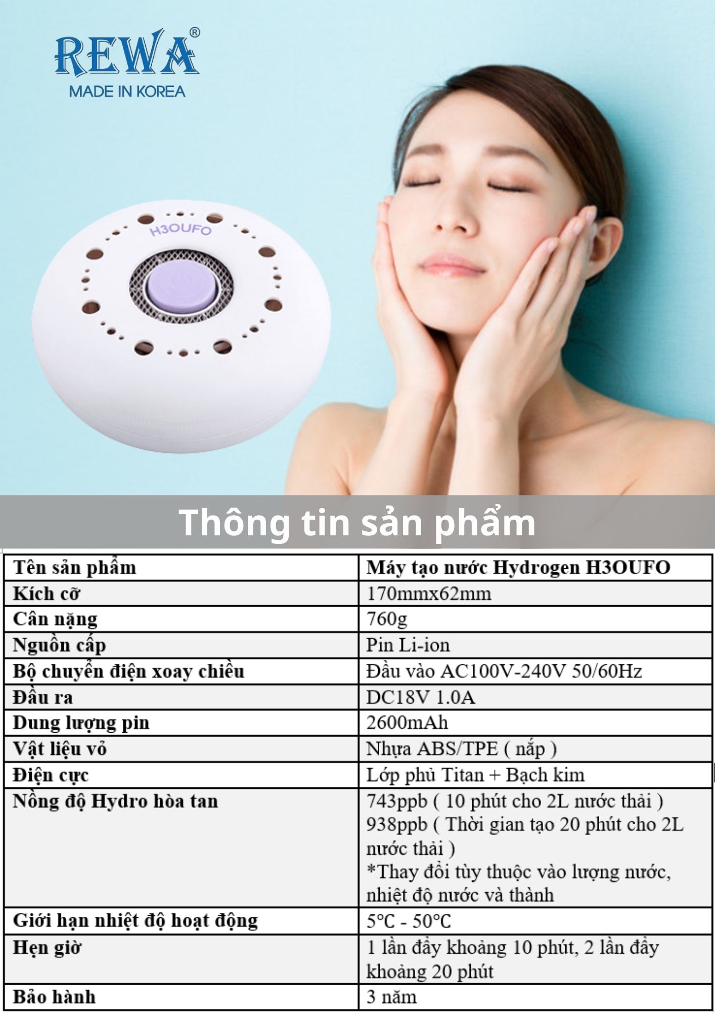 - Kích thước/Trọng lượng: Đường kính 170 x Cao 62mm / Xấp xỉ 760g - Nguồn điện: Pin Lithium-ion - Bộ đổi nguồn AC: Đầu vào 100-240V 50/60Hz Đầu ra DC 18V 1.0A Nồng độ hydro hòa tan: Khoảng 820 ppb (nước máy 2.000 cc, thời gian tạo 20 phút) Khác nhau tùy thuộc vào lượng nước, nhiệt độ nước và nội dung - Dung lượng pin: 2.600 mAh Hẹn giờ: 1 lần đẩy khoảng 10 phút, 2 lần đẩy trong khoảng 20 phút - Phạm vi nhiệt độ hoạt động: 5°C đến 50°C - Chất liệu thân máy: Nhựa ABS/TPE (nắp) - Điện cực: Lớp phủ titan + bạch kim - Phụ kiện: Bộ đổi nguồn AC, dây USB, túi Công dụng: - Làm sạch da mặt với nhiều hydro cho làn da căng bóng và mịn màng. - Chống oxy hóa của nó làm tăng độ đàn hồi và khả năng giữ ẩm, mang lại làn da rạng rỡ. - Kích thích sản xuất collagen và elastin - các chất gây ra sự đàn hồi và độ săn chắc cho da, giúp cho làn da của bạn trở nên trẻ trung và tươi sáng hơn.