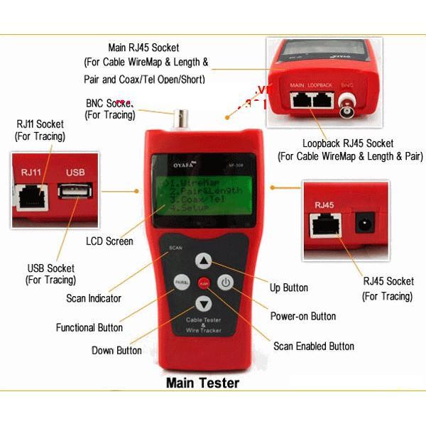 Máy test cable Mạng đa năng RJ 45, RJ 11, USB, cáp đồng trục, Model NF-308, với màn hình hiển thị LCD, đo được số mét, số feet trên chiều dài đoạn dây, xác định đựơc vị trí đứt và nhiều tính năng khác như sau: