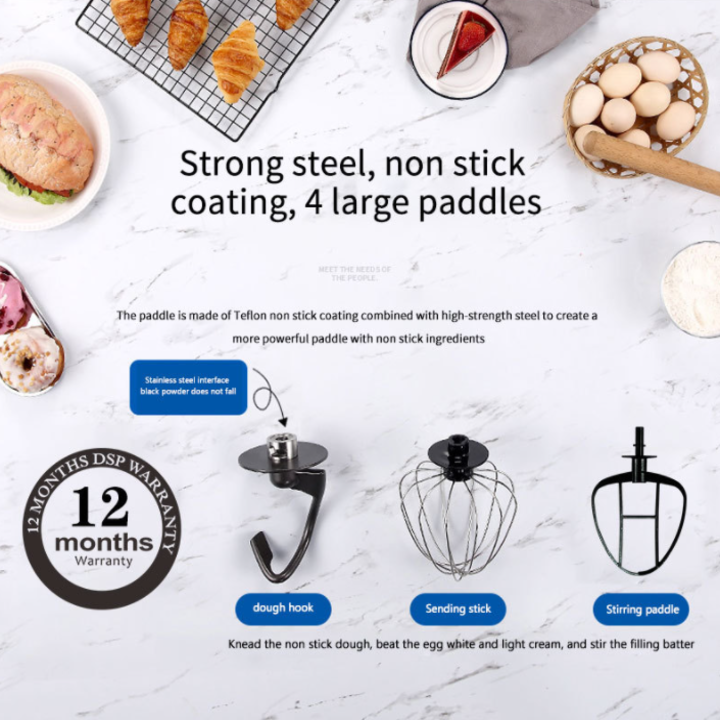 - Lắp que trộn bẹt/que hình móc/ phới đánh trứng trực tiếp cho tới khi khớp vào đúng vị trí. Lưu ý: Đảm bảo que trộn bẹt, que hình móc, phới đánh trứng phải được lắp hoàn toàn, nếu không kết quả trộn sẽ bị ảnh hưởng.