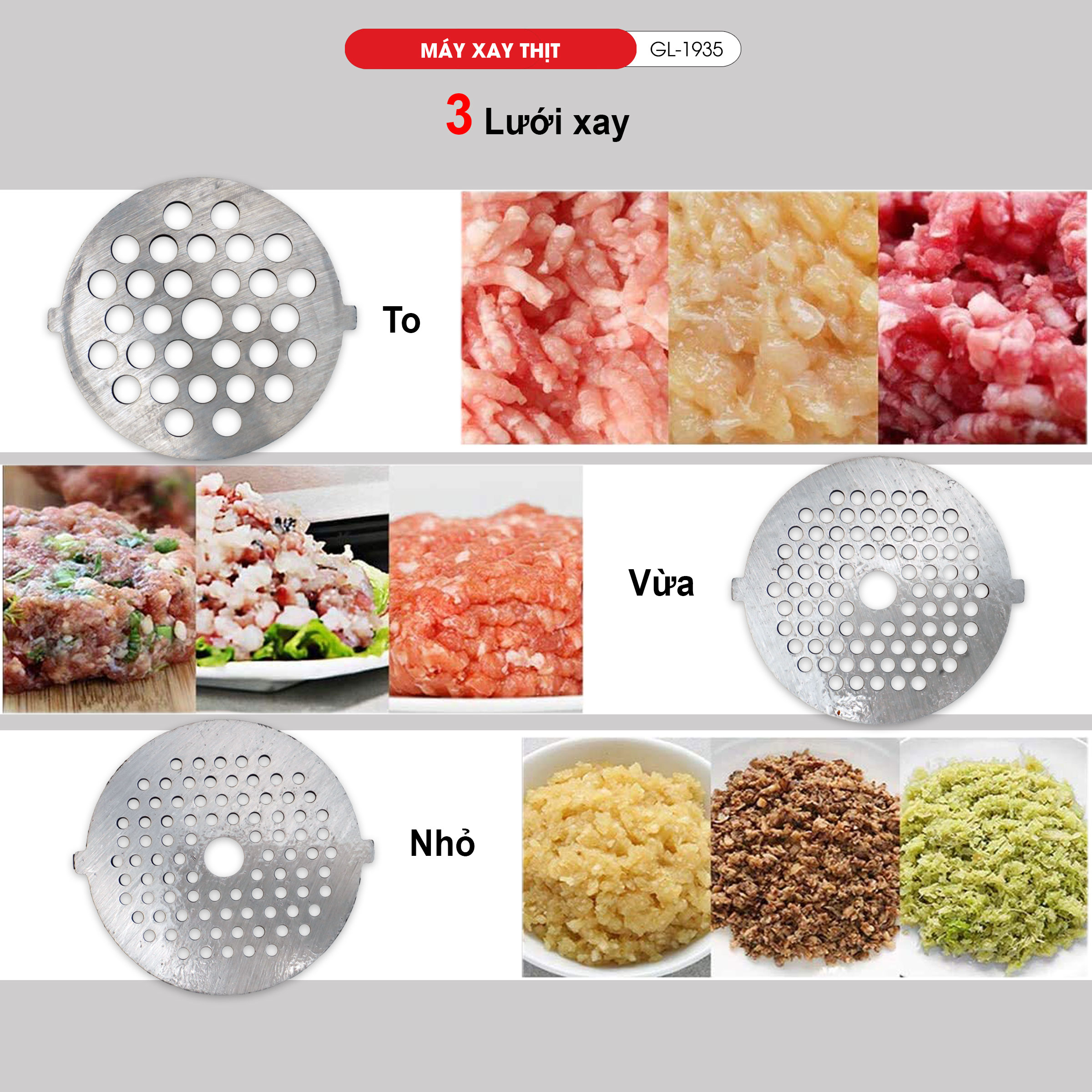 3 lưới xay inox: mịn – vừa – thô, dễ dàng thay đổi độ nhuyễn của thịt hoặc các loại thực phẩm khác.