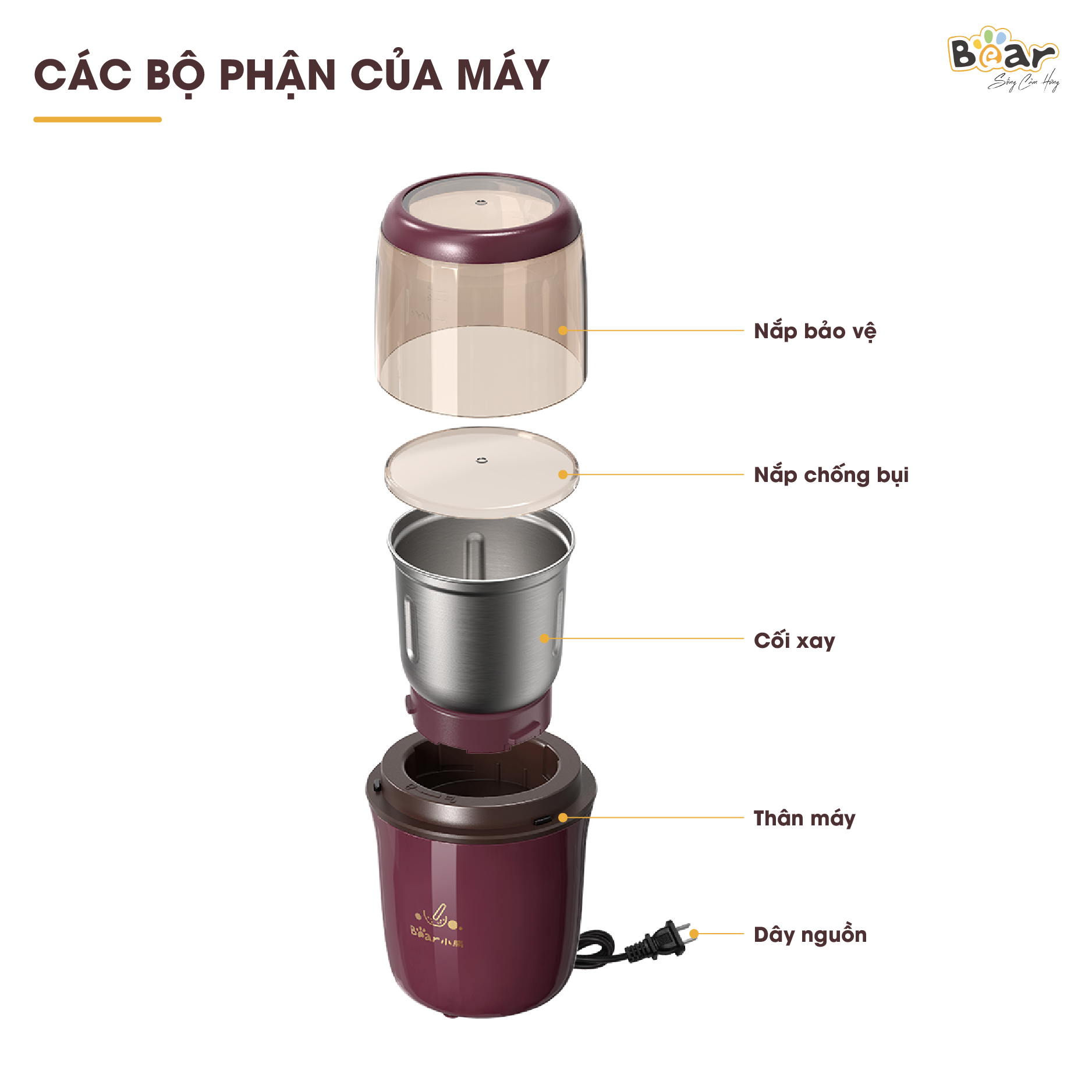 Máy xay bột khô Bear MDJ-A02G3 Thiết kế nhỏ gọn tiết kiệm không gian bếp Công suất: 200 W Chất liệu lưỡi dao: Thép không gỉ 304 Chất liệu cối xay: Nhựa PC Hoạt động