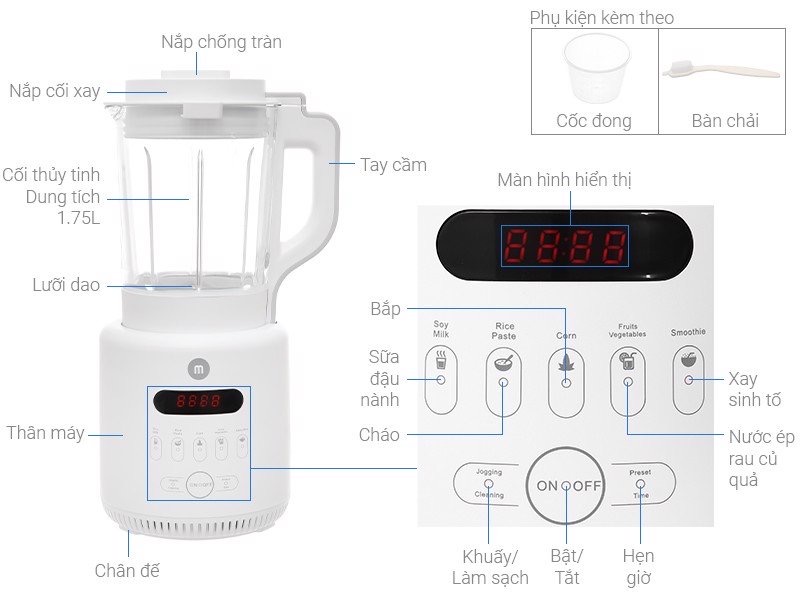 - Ra mắt năm 2021, sản phẩm của thương hiệu Mishio – Việt Nam, sản xuất tại Trung Quốc. ảm bảo an toàn khi sử dụng, kéo dài tuổi thọ cho máy nhờ có chân đế chống trượt, chỉ hoạt động khi gắn cối đúng khớp Bảng điều khiển cảm ứng thiết kế chống nước, thao tác sử dụng dễ dàng, chỉnh chức năng chính xác Có 5 menu nấu tự động được tích hợp sẵn: Xay sữa đậu nành, xay sinh tố, xay bắp, nấu cháo, xay rau củ quả. Ngoài ra máy còn có thêm tính năng làm sạch/khuấy giúp chế biến các món ăn, tráng miệng, làm sạch cối linh hoạt. Công suất xay, nấu của đến 800W, lưỡi dao bằng thép không gỉ sắc bén Hạn chế ăn mòn, xay nguyên liệu nhanh chóng, tiết kiệm điện.